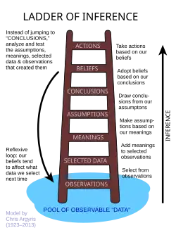The ladder of inference, a metaphorical model of cognition and action created by Chris Argyris. Argyris's original ladder had fewer rungs with different names.