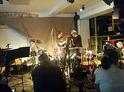 The ex-Henry Cow members have always maintained close contact with each other and Cutler still collaborates with many of them.[7] Cutler and Fred Frith have been touring Europe, Asia and the Americas since 1978 and have given over 100 duo performances. Four albums from some of these concerts have been released. In December 2006, Cutler, Frith and Tim Hodgkinson performed together at The Stone in New York City, only their second concert performance since Henry Cow's demise in 1978.[12][13] Cutler, John Greaves and Geoff Leigh formed The Artaud Beats with Yumi Hara. Cutler and Hara also work together in Half the Sky, a band formed in 2015 to play the music of former Henry Cow member Lindsay Cooper, principally pieces she wrote for News from Babel and Henry Cow. The band have performed in Japan, France, the UK and Germany.[14]