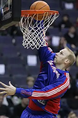 The Clippers achieved their first winning record in 14 seasons and clinched their first playoff spot since 1997. By the end of the season, the Clippers finished sixth in the Western Conference, with a record of 47–35 (their best finish since the team left Buffalo), set to face the Denver Nuggets in the first round. The Clippers beat the Nuggets, but during the series against Denver, opposing player Reggie Evans reached in and yanked Kaman's testicles.[3] Evans was later fined $10,000 for his actions.[4] The Clippers went on to lose to the Suns in the next round.