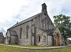 Christ Church is built of coursed and squared rubble stone, with a slate roof. It is made up of a five-bay nave, chancel, west porch and north vestry. The roof's west gable has a bell-cot with a single bell and the west end of the nave contains a gallery designed for the organ and choir.[2] The church's organ was built by Sweetland of Bath in 1857 and later rebuilt in 1936 by W.G. Vowles Ltd of Bristol.[9][14]