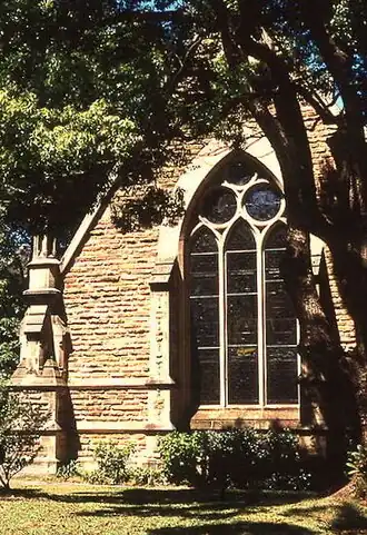 Christ Church was founded in 1868 and the present building was built to Gothic Revival designs by Benjamin Backhouse, chosen by competition.[2] It was constructed by William Eaton in 1869–72, using sandstone quarried on the site. Services of worship have been conducted since 1872. The church uses the most recent liturgy of the Anglican Church of Australia, A Prayer Book for Australia.