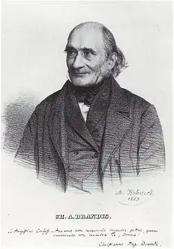 In 1816 he refused an extraordinary professorship at Heidelberg in order to accompany BG Niebuhr to Italy as secretary to the Prussian embassy. Subsequently, he assisted Immanuel Bekker in the preparation of his edition of Aristotle. In 1821 he became professor of philosophy in the newly founded University of Bonn, and in 1823 published his Aristotelius et Theophrasti Metaphysica. With Böckh and Niebuhr he edited the Rheinisches Museum, to which he contributed important articles on Socrates (1827, 1829). From 1836 to 1839 he was tutor to the young King Otto of Greece.[1] Brandis was elected a member of the American Antiquarian Society in 1839.[2]