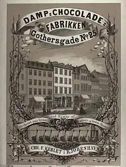The factory was founded by Christian Kehlet (1785–1846) in 1825.[1] Christian Kehlet was originally a tea and porcelain merchant. His chocolate factory may initially have been located in the groundfloor of Pilestræde 98 (later No. 11 and now replaced by the Illum Department Store)[2] but it was from 1830 based at Østergade 34. The machinery was from the beginning operated by steam engines.[3] The factory was later located at Gothersgade 25.
