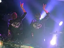 Karlsson is a member of a band called Galantis together with Linus Eklöw, which they formed around 2013.[11] Karlsson and Eklöw had first met by chance at Karlsson's Robotberget studios in Stockholm, sometime in 2007. In 2009, Miike Snow asked Eklöw to remix their song "Animal". Afterwards Karlsson and Eklöw, both based in Sweden, started hanging out in the studio together, playing each other songs and scraps of ideas.[37] In 2012 they stopped the loop-based and software-centric approach, switching to Karlsson's usual method of beginning a song on guitar or piano. "We keep the song naked, and when we feel like we have the right one, we put some clothes on it and see how it feels", says Karlsson.[38] Christian and Eklöw said: "when we started Galantis, we set out to challenge each other and experiment with all of the sounds and ideas that we find exciting. We built a studio on a small island in the Baltic Sea and our surroundings became a source of inspiration."[39]