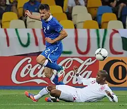 After being briefly being excluded from the national side, he was called up by new head coach Cesare Prandelli on 6 February 2011 for a friendly match against Germany held in Dortmund,[32] and subsequently he became a regular for the team in the right back position under the manager; as a result, he was named to the 23-man Italy squad that took part at the UEFA Euro 2012. Maggio appeared in the first two group games for Italy at the Euros, a 1–1 draw with holders Spain[33] and another 1–1 draw with Croatia, playing as a wing-back on the right in a 3–5–2 formation.[34] Maggio also appeared as a substitute in Italy's 4–2 penalty shootout victory over England in the quarterfinals, following a 0–0 draw after extra-time, playing as a right-back in a 4–3–1–2 after coming on for Ignazio Abate in the 90th minute; during the match, however, he received his second booking of the tournament, which ruled him out of the semi-final fixture against Germany.[35][36]