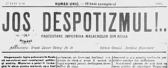 Front page of Jos Despotizmul!.. ("Down with Despotism!!!"), a special issue of România Muncitoare, entirely dedicated to criticism of the Imperial Russian authorities (February 1905)