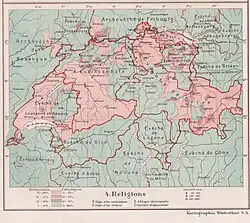 - ^ Total separation of church and state was characteristic of the cantons of Geneva and Neuchâtel, while the Protestant cantons of Bern and Vaud and the Catholic cantons of Fribourg and Valais had a state church.[19]