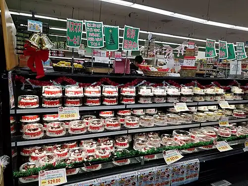 Japanese Christmas cake, a white sponge cake covered with cream and decorated with strawberries, is often consumed, and Stollen cake, made locally, is widely available. A successful advertising campaign in the 1970s made eating at KFC around Christmas a national custom. Its chicken meals are so popular during the season that stores take reservations months in advance.[7]
