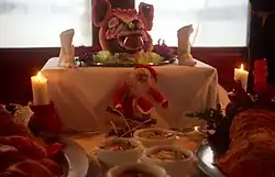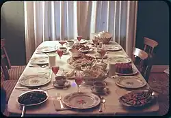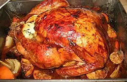 Christmas dinner is a meal traditionally eaten at Christmas. This meal can take place any time from the evening of Christmas Eve to the evening of Christmas Day itself.[1] The meals are often particularly rich and substantial, in the tradition of the Christian feast day celebration, and form a significant part of gatherings held to celebrate the arrival of Christmastide.[2] In many cases, there is a ritual element to the meal related to the religious celebration, such as the saying of grace.[3]