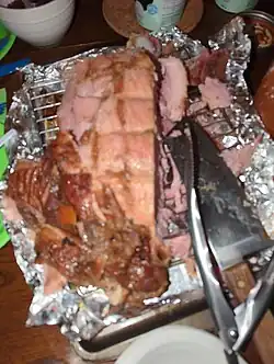 A Christmas ham, or Yule ham, is a ham often served for Christmas dinner or during Yule in Northern Europe and the Anglosphere.[1] The style of preparation varies widely by place and time.
