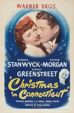 Christmas in Connecticut is a 1945 American Christmas romantic comedy film about an unmarried city magazine writer who pretends to be a farm wife and mother for the sake of her popular lifestyle column who falls in love with a returning war hero while hosting him for a Christmas holiday. The film was directed by English director Peter Godfrey and stars Barbara Stanwyck, Dennis Morgan and Sydney Greenstreet.