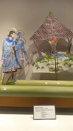 In the Yogyakarta area, Christmas celebrations are marked by a wayang kulit adaptation of the Nativity scene. Church Mass is led by the priest who wears traditional Javanese attire (wearing beskap and blankon) and speaks in the local language. Similar to Eid al-Fitr (lebaran) and Chinese New Year (imlek), during Christmas time, people visit friends and family; children may receive money in an envelope from elders.[9][11]