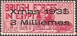 In 1935, British Forces troops stationed in Egypt were issued with a Christmas stamp for their mail home. For many years these were not included in the Stanley Gibbons catalogues, as they classified them as a “seal” rather than a postage stamp, but they have been properly included since the mid-1960s as they prepaid postage and so, despite the inscription "Letter stamp", are normal stamps, and should therefore be counted as the first stamp issued expressly to mark Christmas. Like the slightly earlier Silver Jubilee overprints on the “sphinx” stamp, the Christmas stamps were issued in booklet form in panes of 20.[2]