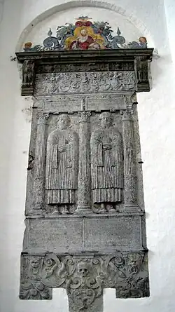 Before the election of Johannes as bishop in 1559, the two Tiedemann brothers had a double epitaph made of sandstone with a Latin inscription placed in the chancel of Lübeck Cathedral, which shows them both in choir dress.[1]