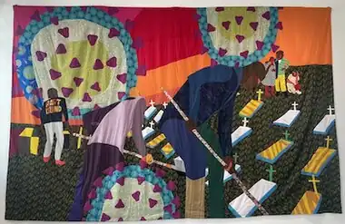 Tapestries have figured significantly in Myers's art. The brightly colored, intricately patterned work draws upon influences including the innovative Quilts of Gee's Bend and simple cutouts of Henri Matisse, the figurative work of Jacob Lawrence, and global regional forms.[36][8][33][37] His exhibitions at The Mistake Room (2017, Guadalajara) included collaborations with Vietnamese embroiderers on images inspired by Lil Wayne rap songs and the "Vxllrncgnt" project—mural-like flags for imaginary nations made from 70-year-old Egyptian sails that were influenced by the colonial history of flags created by the Ghanaian Fante people.[9][38] Myers's tapestries notably mix dissonant modes of tradition—an intimate, quotidian and "warm, folksy art form"[10]—and critique, chronicling difficult narratives, involving, for example, Confederate monuments, slavery, police violence or climate crisis.[37][8]