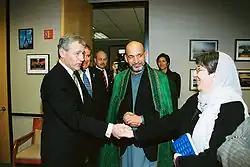 After the 9/11 terrorist attacks, Hagel voted in favor of Senate Joint Resolution 23, authorizing "necessary and appropriate U.S. Military force" in Afghanistan against those who planned or aided the September 11 attacks.[42] During his tenure in the Senate, Hagel continued his support for NATO involvement, and funding in the War in Afghanistan.[43] In a 2009 The Washington Post op-ed after being nominated as Chairman of President Obama's Intelligence advisory board, Hagel said that "We cannot view U.S. involvement in Iraq and Afghanistan through a lens that sees only 'winning' or 'losing,' Iraq and Afghanistan are not America's to win or lose." And that "We can help them buy time or develop, but we cannot control their fates."[44] In 2011, after he left office, Hagel stated that President Obama needs to start "looking for the exit in Afghanistan", and that "We need to start winding this down."[45]