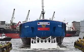 In the late 1980s,[13] the Russian research institutes and design bureaus developed a successor for the 1970s Arktika-class nuclear-powered icebreakers as part of a wider icebreaker fleet renewal program initiated shortly after the dissolution of the Soviet Union.[14] The new 60-megawatt icebreaker, referred to using a type size series designation LK-60Ya,[note 1] would feature a so-called dual-draft functionality which would allow the vessel to operate in shallow coastal areas after de-ballasting.[15] Although the preliminary designs had been developed almost two decades earlier, the LK-60Ya design was finalized in 2009 as Project 22220 by Central Design Bureau "Iceberg"[16] and the construction of the first vessel was awarded to Saint Petersburg-based Baltic Shipyard in August 2012.[17] Three additional contracts in May 2014, August 2019 and February 2023 have increased the number of Project 22220 icebreakers under construction or on order to seven.[18][19][20]