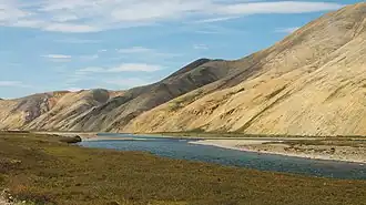 The lower slopes of the mountains have tundra vegetation, often marshy in the intermontane basins, while the higher altitudes are Arctic desert. Rivers are abundant in fish.[10]