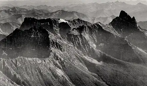 Aerial view looking south at Battlement Mountain (front left), Church Butte (behind left), and Mount Saint Nicholas (right).