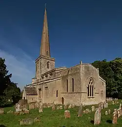 In 1399 Pope Boniface IX granted an indulgence to contributors to the church fabric. Immediately after this the church was remodelled in Perpendicular Gothic style. The west tower was completely rebuilt and the spire and western buttresses added. Then the nave was remodelled with new north and south arcades of delicate octagonal columns. Later in the 15th century new windows were inserted in most parts of the church, and traceried wooden screens were inserted in the chancel arch and at the west ends of the north and south chapels. The arcades are similar to those of St Peter and Paul parish church, Northleach, Gloucestershire, and it has been suggested that they are the work of the same master mason.[2] Sources differ as to when the nave clerestory with its low-pitched roof was added. Jennifer Sherwood in The Buildings of England includes it in the early 15th-century remodelling,[1] but the Victoria County History attributes it to the early 16th century.[2]
