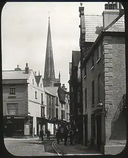 By the 1830s, Church Street had become increasingly congested and insalubrious, "narrow and dangerous".[3] According to local tradition, a local gingerbread maker, Mrs Syner, was closing the shutters of her shop one evening when the mail coach to Liverpool went through at a gallop. Her apron strings were caught in one of the horses' harnesses, and she was dragged along the ground for some distance.[4] Escaping serious injury, she grabbed the coachman's whip, knocked out some of his teeth with the handle, and marched back to her shop to begin organising a petition for a new road to be built to bypass Church Street. The Borough Council then organised a competition for the best scheme, with a prize of £10 for the winner. The prize was won by local architect George Vaughan Maddox, who proposed a new carriage road — now Priory Street — on a viaduct immediately above the bank of the River Monnow. Work began on the new road in 1834, and it was opened in 1837.[5][6]