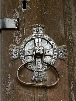 There are two tiny transepts, and the entrance of each is supported by a central pillar dividing arches echoing the design of the chancel arch and its pillared corbels. Above the transept windows and west windows are ventilation slits which are now glazed: a reminder that this is a cemetery chapel. One window of the south wall and two windows on the north wall of the nave contain stained glass. When the building was listed in 1975 it still had the original stained deal pews, but during the restoration of 2014 some of these were removed, and some were stacked in the chancel.[1] The Church of England has removed the "beautiful font of Harehills stone ... of elegant design and artistically wrought," although as of 2014 the lid still existed, hanging on its pulley. Both font and lid were carved and installed in 1871.[15]