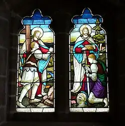 The chancel arch is in doubled form, having an inner and an outer structure. The inner structure is supported on pillared corbels: a half-capital carved with acanthus leaves is supported on a short, smooth, round, half-column which is supported in turn on a corbel in the form of an inverted, fluted half-cone. The chancel window has three lights with a lancet window on either side; all filled with stained glass. The vestry is attached to its south wall, and the organ chamber is a lean-to opening from the chancel's north wall and connecting to the north transept via a door. The hardwood choir stalls, the south pulpit, the lectern and the communion rail were made by Thompson of Kilburn (1876–1955) and are not original to the building. The remaining north pulpit is original as designed and commissioned by the architects.[1]