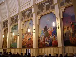 It is a work from the most expressionist period in Eusa, characterized by the combination of white concrete and red brick, a style that has been defined as déco-expressionism or geometric expressionism.[1]