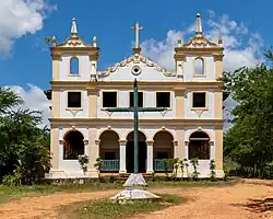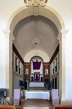 The Church of Our Lady of the Conception of Comandaroba was designed with "all the characteristics of the Society of Jesus".[6] It is a structure consisting of mixed masonry of stone and brick, with a central façade flanked by bell gables with round arched openings. A veranda surrounds the front of the church and sides of the nave. It opens to the exterior via arcades. The façade has three arcades that give access to the veranda. The other arcades are blocked and form parapets, two flanking the central arcades, and numerous on either side of the church. The portico is of limestone with the monogram "A.M.D.G. 1734", the Latin motto of the Society of Jesus and year of completion of the structure.A The entrance of the tunnel built by the Jesuits is located behind the chancel, and is now sealed.[2][6]