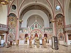 The church has an iconostasis, a feature of Eastern Orthodox churches that stands before the sanctuary. It was made by some of the best icon-painters in Moscow.[4] A preexisting wall in the church was used for this purpose, but it first needed to be prepared for painting through reintroducing plaster in some areas and removing paint from plaster in others. Because of the church's new ties to Russia, these renovation efforts needed to be supervised by a conservator of monuments from St. Petersburg, who participated in video-conferences at certain junctures.[5] Among other saints, it includes three Germans who were canonized by the Russian Orthodox Church.[4] The paintings were made with pastel pinks, oranges and greens as well as shining gold and other colors.[8] The fresco painting techniques that the icon-painters used to convert the previously existing wall into an iconostasis make this work unique in Europe.[5]