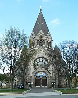 Among the changes on the outside of the church are five little onion-domes on top of the church's spires. On top of each of these is a small shining Greek cross.[4] Because of its rounded architecture and its Gothic and Romanesque features, it was already somewhat similar to the Byzantine Eastern church style. The updates to the building have made the differences from an Eastern Orthodox church even less noticeable.[5]