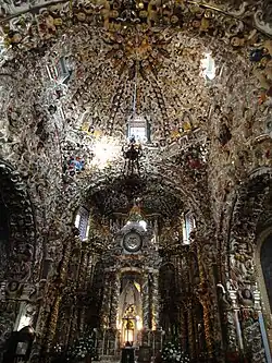 The church is valued for its decoration in what is called folk or indigenous Baroque.[2] The church was initially built in the 16th century and developed over four phases until the 19th century. At the end of the 17th century, it had its basic layout, cupola, sacristy and main altar. At this time its intricate stucco work was begun. The first phase of construction began in the 16th century, with a small sanctuary, whose vestiges are located just north of the current church. The first church on this spot was built in the middle of the 16th century with a simple nave and façade, now destroyed. The second phase began at the end of the 17th century and beginning of the 18th, when the bell tower, cupola, basic layout and a small sacristy were built. Decorative stucco work was also done on the apse. The third phase covers most of the 18th century when the structure was completed, expanding the nave, leaving the tower within it, and a new façade. The last phase covers the 19th and early 20th centuries, when the final details were finished.[3] These details include pre-Hispanic elements such as dark skinned angels, others with blond hair and blue eyes, niches with headdresses, tropical fruits and ears of corn. This area was sacred to Tonantzin, the mother goddess, and the Spanish replaced her with an image of the Virgin Mary.[4]
