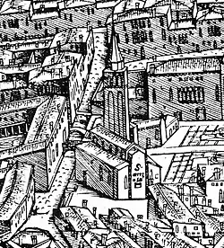 San Michele Arcangelo stood in front of the monastery of the Santo Stefano, along the adjacent canal, with its facade facing the square. The facade was plain, with a central portal and three large semi-circular windows. The church had a tall campanile with a spire; three earlier campaniles had collapsed,[1] the third collapsing with fatalities in 1455 shortly after the engineer and architect Aristotele Fioravanti had performed work to correct a worrying tilt.[1][2]
