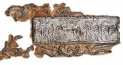 The location of the founder's tomb was determined to be Grave No. 15, buried on the outside of the southern wall of the narthex. On the remains of a deceased young male were found parts of a robe with 27 silver buttons with gold embroidered work. In addition to ornamented detail, there were also preserved metopes with the name of Tsar Ivan Alexander.[13] The embroidery in gold appears to have been made in an atelier working for the Bulgarian royal court.[14]