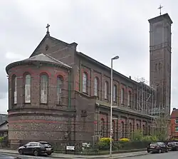 The church is built in the style of an Italianate basilica. It is constructed of common brick with banding of red and blue brick, and a slate roof. The plan consists of a nine-bay nave with a clerestory, lean-to aisles, a chancel with a round apse and a high thin northwest campanile with narrow lights. All the windows are round-headed.[1][4] The top stage of the campanile has round-headed, louvred bell-openings and sill courses, a cornice and a pyramidal roof. The west front has an enclosed porch with a gabled round-headed entrance over which is a roundel with a bust of Christ. Above this are three windows surmounted by a roundel.[1]