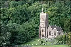 The old church was demolished and construction of the new church began in 1853,[6] with the foundation stone being laid by Sir Acland in October that year.[7] Construction was carried out by workmen employed on the estate, under the supervision of Sir Acland, and the work using Doulting stone was carried out by Messrs Wall and Hook of Stroud. The church was consecrated by the Bishop of Bath and Wells, the Right Rev. Robert Eden, on 17 October 1856. It cost over £16,000 to complete.[4]