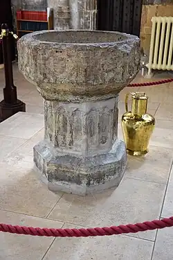 The pulpit dates from the 15th century.[4] The octagonal font was carved in the 14th century. It was returned to the church in the 19th century after it had been discovered in the abbey grounds.[3] The brass chandeliers were made in Bristol in 1701.[7]