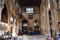 The layout of the church includes a three-bay chancel and three-bay aisled nave.[1] The nave includes arcades of tall piers with carved angels at the tops supporting arches and windows.[10] The west tower houses bells which have been added to and recast, mostly by Rudhall of Gloucester, over the centuries.[7][16]