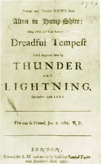 On Sunday when the Reverend Minister of the parish was towards the latter end of Prayer before Sermon, it grew on a sudden so exceeding dark that the People could hardly discern one another, and immediately after happened such flashes of lightning that the whole Church seemed to be in a bright flame; the surprise of the Congregation was exceeding great, especially when two Balls of Fire made their entry at the Eastern Wall, pass'd through the body of the Church, leaving behind 'em so great a Smoke, and Smell of Brimstone as is scarce able to be expresst.[20]