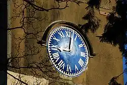 In 1874, on the initiative of the Alton Church Tower and Steeple Repairing Fund, the steeple was faced with oak to replace the lead that previously covered it, and a weather vane was placed atop it; this is the steeple that we see today.[30] Over the years a number of turret clocks have been positioned on the tower; Couper states that there had been one since "at least the 17th century", based on the references in the church accounts to "the diall",[31] and it has a clock (not on display) with the date 1700 on it. The clock in use today was installed in 1890 by Messrs J. W. Benson; a Mrs Gerald Hall started its mechanism at 12 noon on Saturday 7 June 1890.[31] Sundials have also long been used in the church; one on a buttress on the church's east face is either from the 14th century or earlier.[31] The one currently in the churchyard dates from the 18th century.[31]