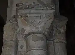 The present-day church had its origins in the Norman period, with building probably starting at some time not long after 1066.[2] The conventional date for the founding of the church is 1070, and the church celebrated its 900th anniversary in 1970. This early church took the shape of a cross, the four Norman arches that formed the tower being described in Pevsner as "emphatically Early Norman, say around 1100".[3] These arches, built of stone probably from Selborne or Binsted,[4] are situated midway down what is now the southern nave, and some remnants of the original door may be seen in the wall behind the 19th-century font located in the centre of the arches.[2] At the top of the pillars supporting the arches are designs fashioned by French craftsmen with axes,[2] including a wolf eating a bone (pictured, below left), a pelican, several winged cherubs, a demon and a pair of donkeys.[2]