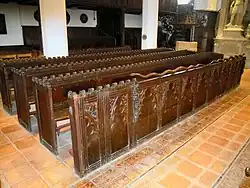 Today the church is best known for the richly ornate wooden carvings with which it was "beautified" by the Rt. Hon. Robert Henley-Ongley, 3rd Baron Ongley of Old Warden in the mid 19th century. From widely differing periods and mostly from Belgium, France and Italy, the carvings are said to include a number of panels removed from the private chapel of Anne of Cleves; these can be identified by the initials AC surmounted by a crown. A number of wooden panels including 15 showing Biblical scenes were stolen from the church in 1997 and were never recovered. It is intended to replace them with contemporary carvings of a similar nature.[2]