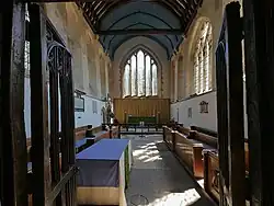 Three galleries were removed during 19th-century restoration.[18] The 15th-century oak chancel screen was removed by Butterfield and reinstated in 1907.[19] Butterfield designed new furnishings, including the pulpit; most of these survive, but his decoration of the east wall in marble and polychrome tiles is hidden behind a curtain,[20] and has been covered since at least 1979.[21]