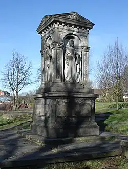 The churchyard contains the grade II* listed funerary monument to John Brooks (1788–1849) of Crawshaw Hall, the son of cotton entrepreneur and banker William Brooks. The monument was sculpted by John Thomas and cost approx £3000.[19] John Brooks was a partner in the calico printing firm of Cunliffe & Brooks who had a mill near Blackburn. He was also Secretary of the Anti-Corn Law League and a philanthropist. The monument comprises a panelled pedestal of granite set upon a large, square stone plinth and was originally enclosed by railings, which were removed as part of the war effort during the Second World War.[20] It has a square aedicule of Sicilian marble above with niches to each face framed by decorated piers, each containing a life-size carved female figure in classical dress. Each face is pedimented with a bracketed cornice beneath interspersed with carved medallions. The north face contains the figure "Industry" depicted with a wheel, the west face the figure "Commerce" depicted with bales of cotton/calico, the east face the figure "Charity" depicted with babes in arms and the south face contains the figure "Integrity" depicted holding a book. Carved decorations to the piers and spandrels include depictions of cotton and flax plants, roses, poppies and oak and laurel leaves.[20] The figure of Charity was exhibited at the Great Exhibition of 1851.[21]
