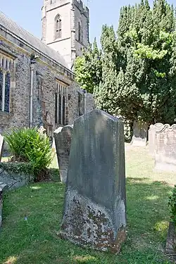 The churchyard has the graves of two soldiers who died at Waterloo and of Robert Willance, a local alderman and draper.[42] Willance was out hunting in 1606 when his horse fell off Whitcliffe Scar with Willance suffering a broken leg and the horse dying.[43] Willance's amputated leg was buried in the churchyard, with Willance being reunited with his leg ten years later when he died.[44][45]