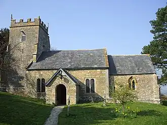 The stone building has Doulting and hamstone dressings and slate roofs. It consists of a three-bay nave and two-bay chancel with a small vestry and south porch.[1] The nave walls incorporate remnants of 12th-century carvings.[5] The west tower is supported by angled buttresses and contains bells from the 14th and 15th centuries.[1]