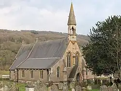 The church is constructed of Old Red Sandstone with Bath Stone dressings, creating a polychromatic display.[3] It has a nave, roofed in Welsh slate, a chancel with vestry, two porches and a bellcote.[1] The architectural historian John Newman describes this as "an extraordinarily elaborate belfry, a sort of pulpit in the sky".[3] The style of the whole is Early French.[1]