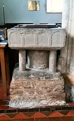 The font itself, which is of the Norman period, dates to the late 12th-century and so predates the church in which it sits; it has a square bowl sitting on a round stem and supporting pillars with four flat blank arches to each side of the top.[5][7] In this font was baptised Saint Cuthbert Mayne (1544–1577), the first English Roman Catholic "seminary priest" to be martyred under the laws of Elizabeth I.[8] Mayne was beatified "equipollently" by Pope Leo XIII, by means of a decree of 29 December 1886 and was canonized along with the other Martyrs of England and Wales by Pope Paul VI on 25 October 1970.