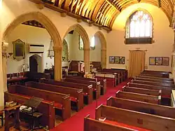 The roof of the nave is wagon-shaped with open timbers and dates to the late 19th-century but may incorporate some earlier timbers.[1] The nave is separated from the South aisle by one narrow and three wide bays. The aisle is of the Perpendicular period having been added between 1560 and 1590. The tops of the columns are decorated with leaves, shields and faces on the capitals. The column nearest the baptismal font has the date 1620 on the capital; as the column is no later than 1590 in date it is not known to what this date is referring.[4]
