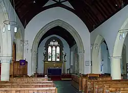 The interior of the church includes a wooden board listing the names of 23 people from the parish who died in World War I and 13 in World War II.[12]